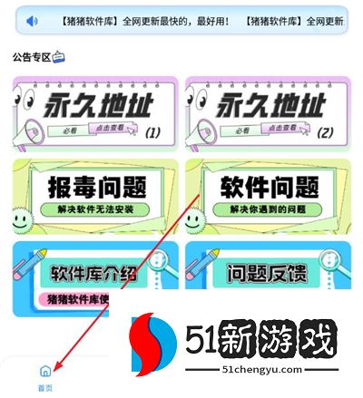 1、猪猪软件库提供了四个板块,首页板块中拥有公告专区,让用户可以查看永久地址,了解软件问题。