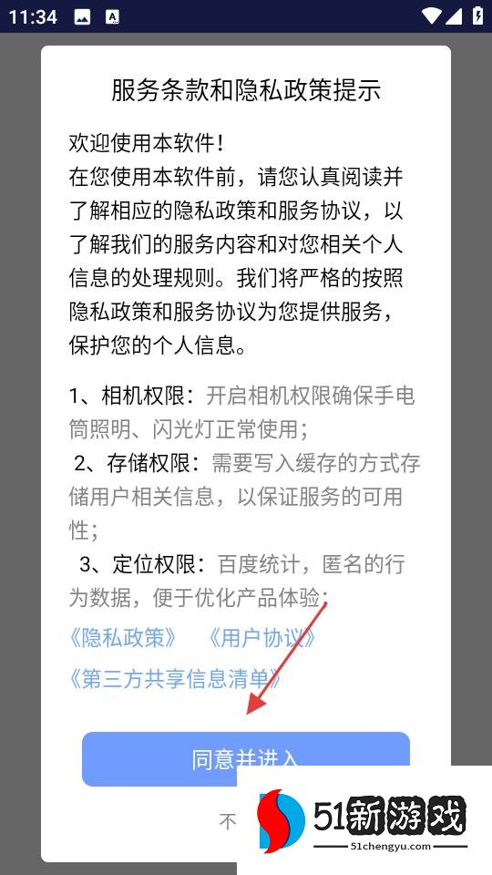 1、下载安装完成后进入,需在用户协议和隐私政策界面点击同意,接受相关条款后才能进入应用。