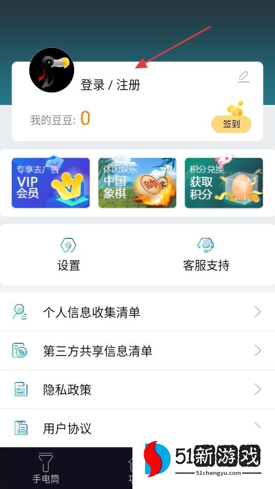 2、我的页面有登录、注册入口,显示我的豆豆数量,可签到,还有VIP会员、休闲娱乐中国象棋、积分兑换获取积分等功能板块。