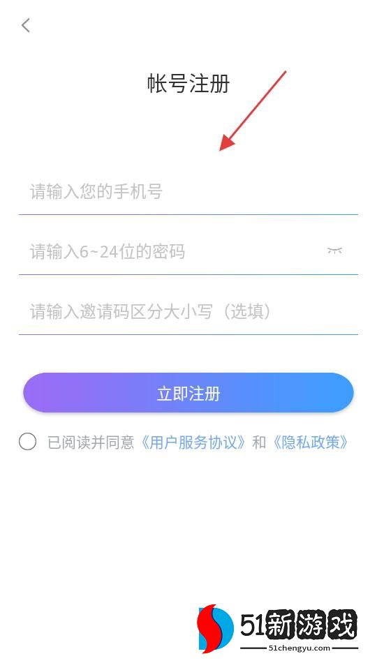 4、帐号注册页面,需输入手机号、密码,邀请码为选填项,点击立即注册,注册前要勾选同意用户服务协议和隐私政策。