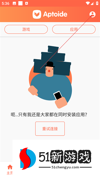 1、Aptoide是第三方安卓应用商店,其首页分为【游戏】和【应用】两个板块。如果遇到连接问题,可以点击“重试连接”恢复访问,该功能支持用户自建应用商店。