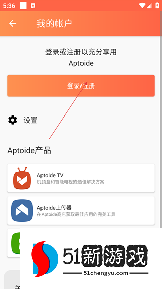 2、点击右上角的账户图标,进入“我的账户”页面,可以通过“登录/注册”进入账户流程,查看Aptoide TV等衍生产品。
