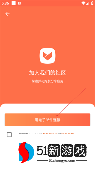 3、在注册界面选择“通过邮件连接”,需要先查看接受条款和隐私政策。该应用程序支持社区功能,需要注册。