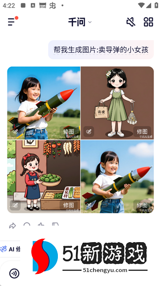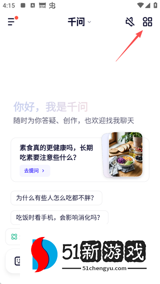 1、首先打开千问App,完成登录后,找到并点击页面右上角的格子图标,进入AI创作功能入口。