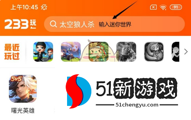 1、打开233游戏乐园之后,进入App首页,这里小编以迷你世界为例。在屏幕上方的搜索栏中输入迷你世界进行搜索。
