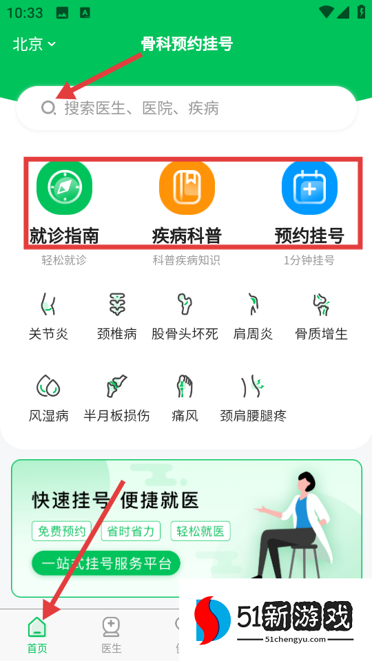 2、首页顶部搜索栏可查找医生、医院、疾病,就诊指南助患者轻松就诊,疾病科普传递骨科病知识,预约挂号实现快速挂号,底部可切换首页、医生等导航栏。