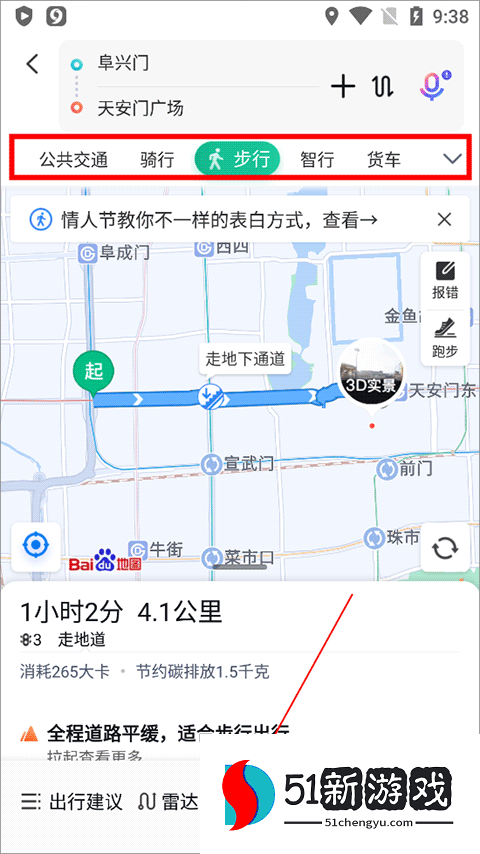 2、在新打开的页面上,通过页面顶部的导航模式设置栏(如下图中的红色框所示)确定路线并将导航模式切换为步行。点击页面底部的“真实导航”按钮(如下图中红色箭头所示)。