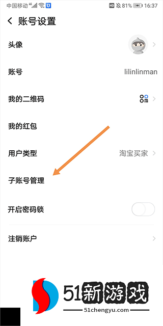 3、然后在打开的账户设置界面中点击“子账户管理”。