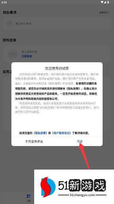 1、第一次使用,请阅读隐私政策和服务协议。确认后,点击“同意”按钮进入申请。