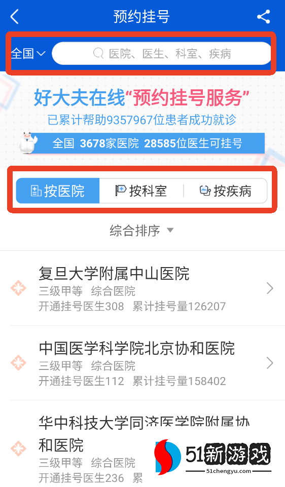 2、选择医院,您可以按地区搜索或按医院、科室和疾病查看。