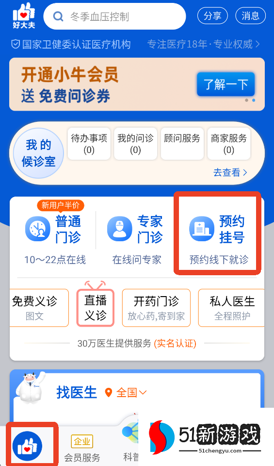 1、点击主页上的“预约登记”,预约线下医疗。