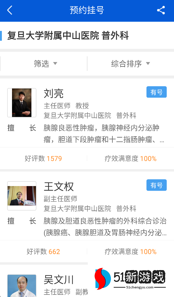 4、它将显示医院中所有与相关疾病相关的医生,您可以看到他们对治疗结果的积极评价和满意度。