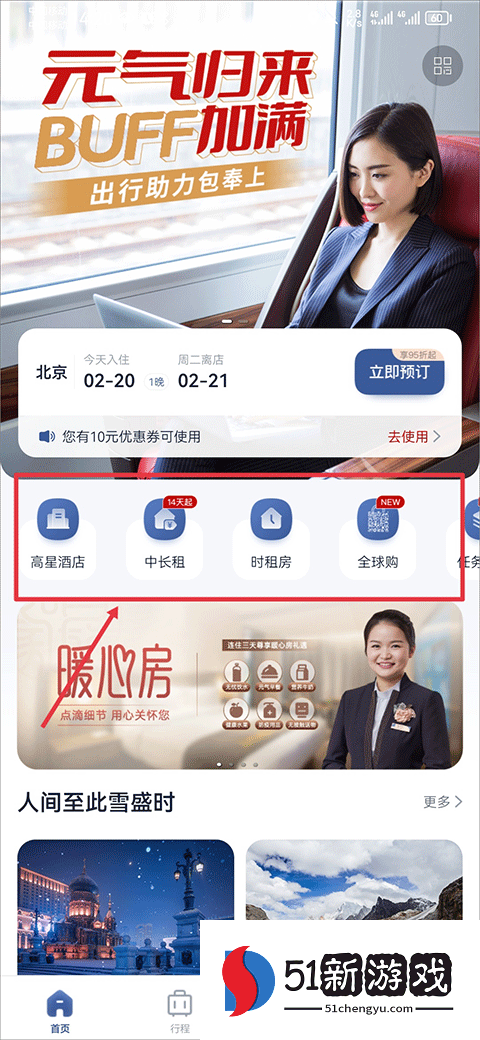 1、打开应用程序,从主页中选择是要预订高星级酒店、中长期租赁还是临时租赁。