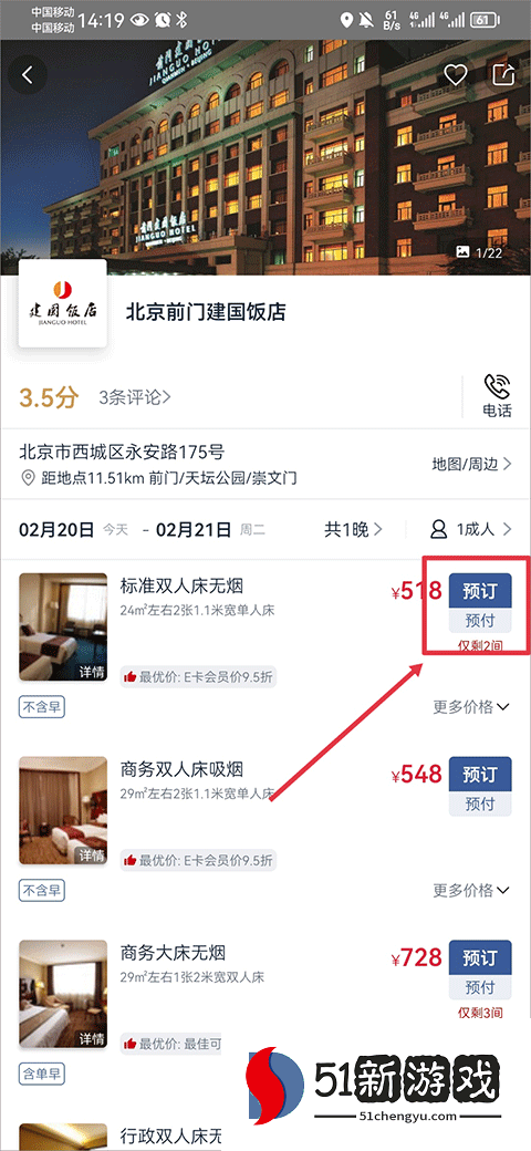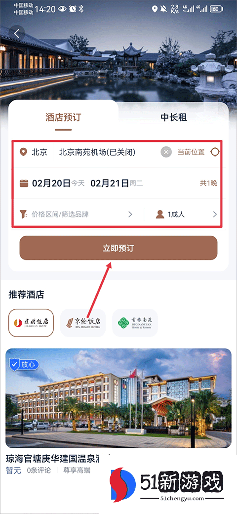 2、例如,对于一家高星级酒店,输入后,选择酒店位置、入住和退房时间、价格和人数,然后单击立即预订。