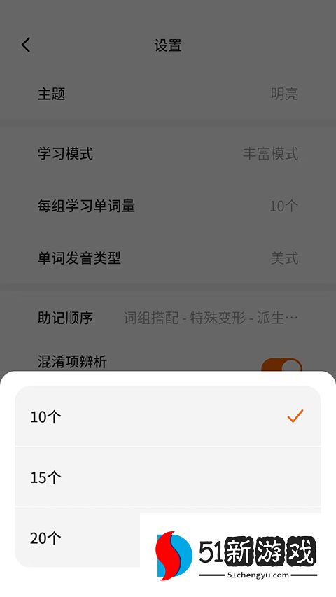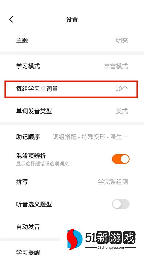 3、进入设置界面,选择“每组学习字数”选项。