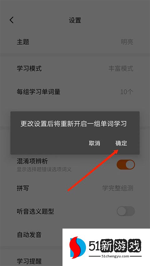 5、更改设置后,将开始一组新的单词学习。选择“确定”,将成功设置每日词汇表。