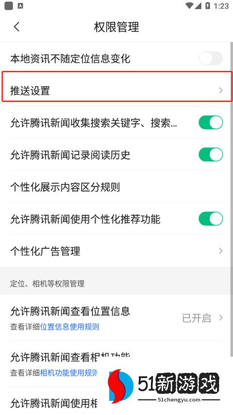 4、在权限管理中点击“推送设置”。