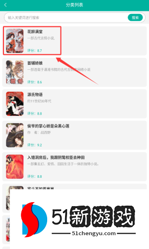 3、在类别列表中,单击红色框突出显示的小说,它将用鲜花填满房间。