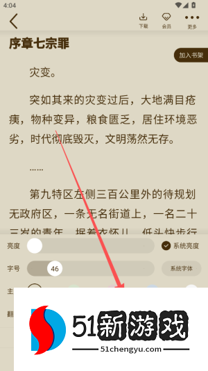 3、阅读时,点击屏幕中央可以打开菜单栏。在这里,您可以调整字体大小、背景颜色或打开夜间模式来保护眼睛。
