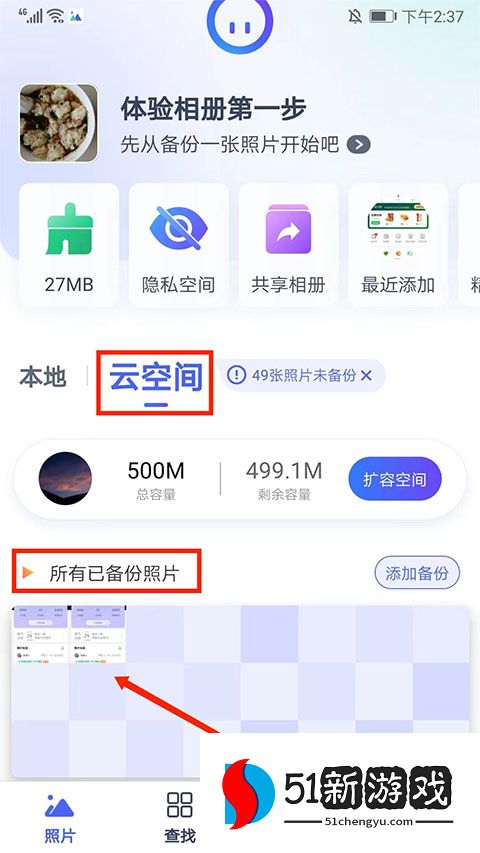 4、在云空间部分,您可以看到“所有备份的照片”。