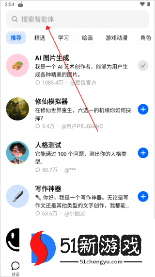 2、在发现页面,点击搜索栏,输入想要的AI智能体。